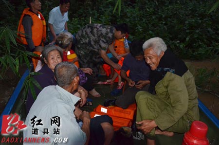 20日晚7时30分左右,道县民兵在祥霖铺镇迟竹源村,转移被洪水围困的村民