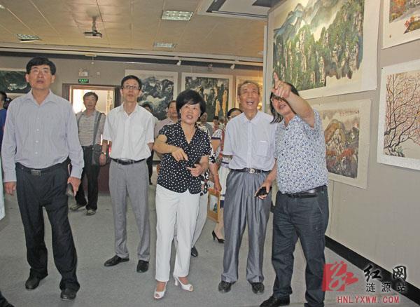 娄底市委常委、宣传部长伍美华(前排右三),娄底市委宣传部副部长、市文联主席王骥远(左一),涟源市委常委、宣传部长肖更新(左三),在邓兆凡(右二)陪同下观看展览。