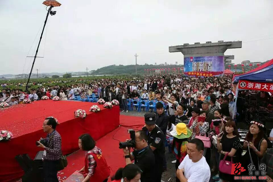 9:20许,活动在一段欢快唯美的开场歌舞《玫瑰花歌曲联唱》中拉开帷幕,动力伞在空中拖着彩烟表演着各类高空飞行,石鼓区委副书记、副区长黄辉致开幕辞,衡阳市委常委、警备区政委廖茂雄宣布活动开幕后,华耀城(衡阳)有限公司等7家企业与衡阳市潇湘和创农业实业有限公司现场签署了营销战略框架合作协议,助力石鼓区培育亿元花卉产业,发展集旅游休闲、玫瑰花卉产业、相亲交友为一体的“玫瑰风情”小镇。身着玫瑰花服的“花仙子”在T台上尽显青春活力,66对新人伴随着亿从天抛洒的花瓣和花海深处蹁跹的蝴蝶,十指紧扣,深情相拥,热烈深吻、庄严宣誓,迎来现场热烈的欢呼,将整个活动推向高潮。