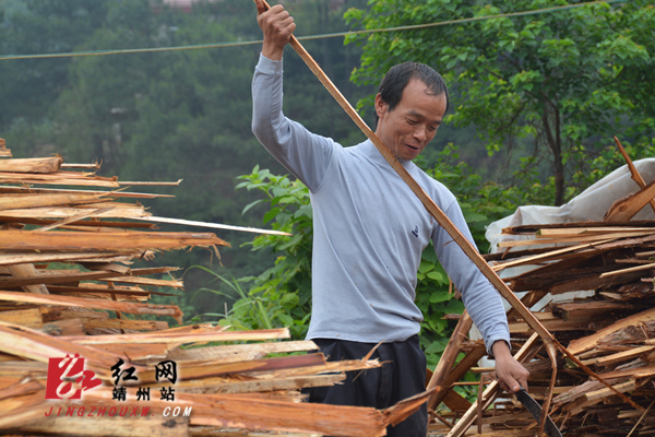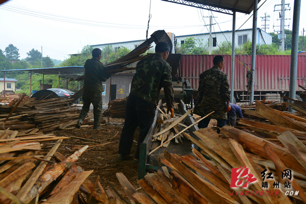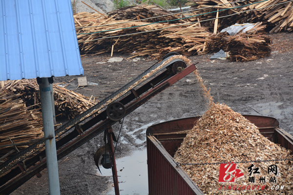红网靖州站5月26日讯(分站记者 陈俊名 通讯员 吴世武) 5月25日上午,记者来到靖州江东管委会团结村梨子园废旧杉木削片加工厂,只见厂内机器轰鸣、削片飞舞,工人们有的在铲除杉木皮,有的在给木片打梱,干得热火朝天。