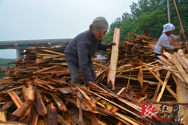 74岁的王奶奶正在对废旧杉木进行去皮处理 陈俊名 摄