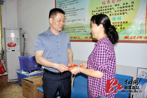 湘潭县委常委、宣传部长刘耀奇(左)在中路铺欣欣幼儿园开着“六一”慰问活动。