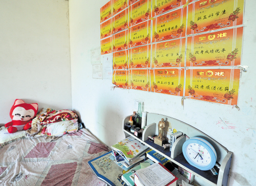 “小心别碰到闸门了。”周美玲的父亲周炬把记者迎进房里。简陋的两居室是周美玲爷爷留下来的,卧室里面放着两张床,大床是周炬、胡金华夫妻用,小床则给周美玲睡。在周美玲的床头,摆放着一个布娃娃,靠墙的一面,贴着她从小学一年级到六年级所得的奖状,一共26张。