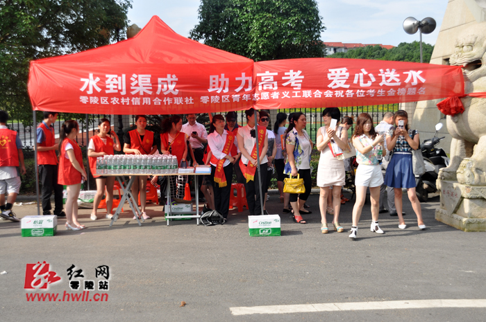 红网零陵站6月8日讯(通讯员 陈斌 周中正 罗志仁 李文东)6月7日上午,2015年全国高考正式拉开帷幕。4140名零陵高考学子走进考场,迎接他们人生中的第一次重大抉择,而考场外,零陵区众多爱心企业和志愿者也没有闲下来,用他们自己的方式来为考生和家长服务,共同助力高考学子圆梦。零陵区农村信用联社和零陵区青年志愿者义工联合会联合组建的高考爱心送考、送水服务队,就是零陵高考期间众多爱心服务队中人数最多、服务项目最多的一个。早在8点之前,10台贴有“爱心助考”字样的送考车便已早早的安排在各考点周围,同时还在各考点入口处安排设置了服务大棚,里面的摆台上摆满了纯净水和降暑降温药品,高考考生以及陪考家长均可免费享用。