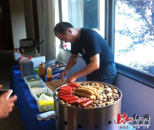(发布会现场,师傅在现场制作台湾美食——大肠包小肠)