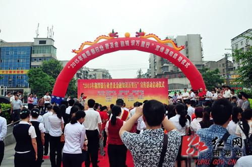 启动仪式后,湘潭市金融办、湘潭银监分局、湘潭银行业协会、市区各银行业机构、雨湖区金融办、雨湖区16个乡镇街在白石公园广场,通过各种各样的形式,开展打击非法集资、存款保险与利率市场化、金融联网、反假币、信用卡及防诈骗、防抢劫、防范非法集资等金融知识宣传。