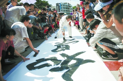 下图:启动仪式上,著名书法家徐双喜在50米长、1.5米宽的宣纸上挥毫泼墨,书写了《金刚经》经文中的33个榜书大字。 王腾云 摄