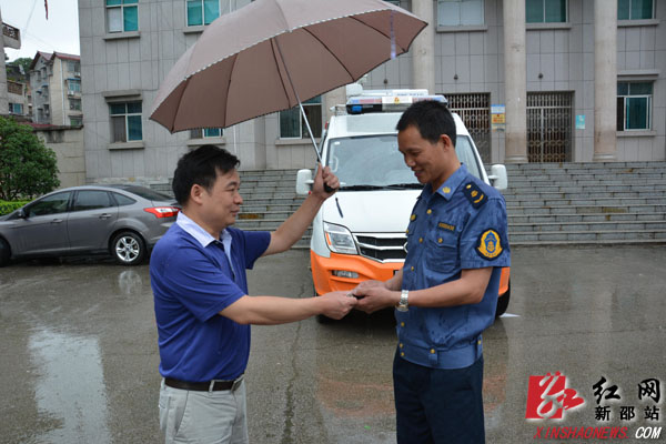 新邵县副县长、县集中治理车辆超限超载工作领导小组常务副组长王炉军(左)将治超流动检测车钥匙交给执法人员