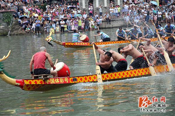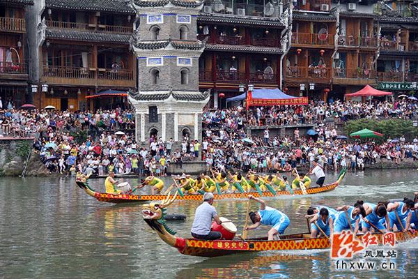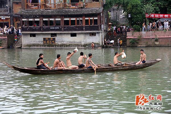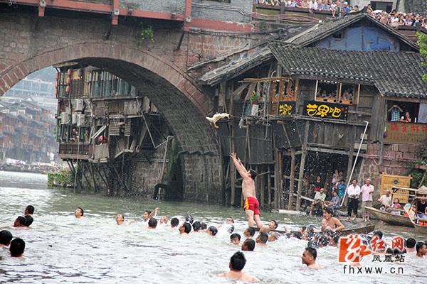 端午佳节,龙舟竞渡,这是我国千百年来的传统习俗。然而“凤凰版”的端午节,赛完龙舟之后还有一个精彩的节目——抢鸭子。这是凤凰本地的一个特色民俗活动。当一年一度的龙舟比赛举行完后,主办单位把许多水鸭子从吊角楼上扔下来,每个人都可以泅水抢夺,抢得的鸭子归自己所有。