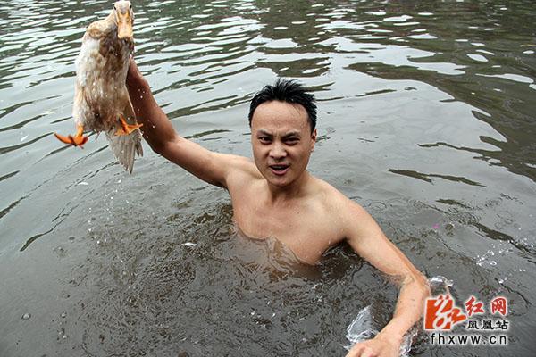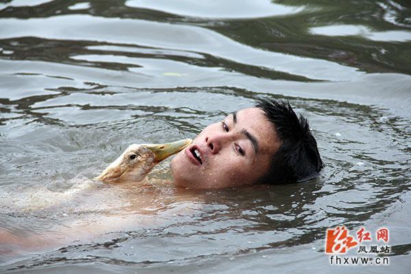 当天下午,只见碧绿的河水中,许多年轻人光着膀子,鱼儿一样游来游去,追逐着水中的鸭子;有的则一个猛子,泅入水中,等接近鸭子时突然伸出手来,一把锁定目标;有的则跃出水面,把被抛下的鸭子直接当空截住……岸上观众的欢呼声此起彼伏,连绵不断,气氛十分热烈,把整个端午节活动推向了高潮。