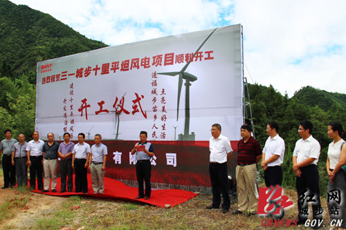 红网城步站6月25日讯(分站记者 肖丁勤)6月24日上午,城步苗族自治县白毛坪乡十里平坦山脚下,在一阵隆隆的礼炮声中,三一城步十里平坦风电场第一期工程胜利开工。三一集团总裁助理胡杰,三一集团总监贺勇,县委常委、政法委书记钟胤进,县人大常委会副主任杨青礼等出席工程开工仪式。