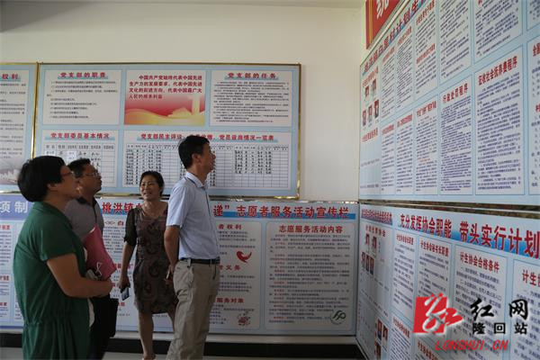 隆回县委书记赵湘明(右一)在隆回县桃洪镇白里村查看工作宣传牌内容