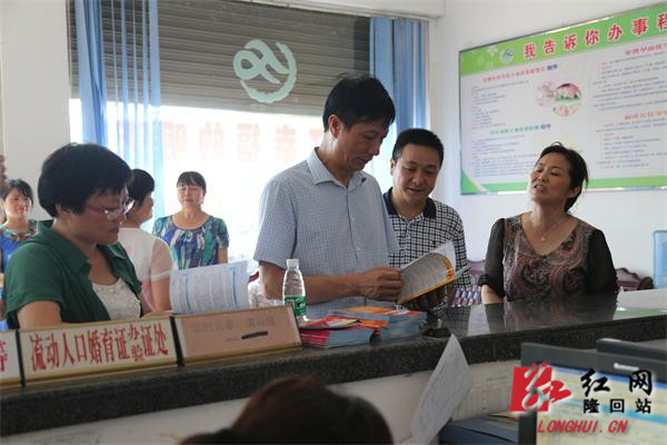 赵湘明(右三)在桃洪镇计生政务服务大厅翻阅计生资料