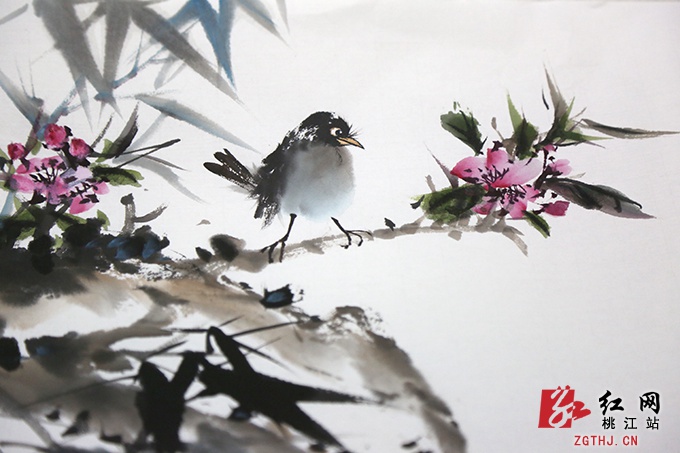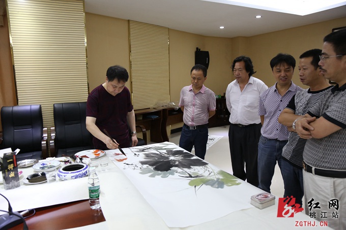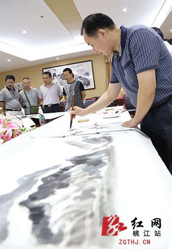 周易介绍他所画的一幅山水,说:“这个是我们昨天到桃花湖采风看到的优美场景,我把竹的主题融入到画面里面,使桃花湖的景色和楠竹之乡的主题融入到画面中,成为一个有机的整体。”