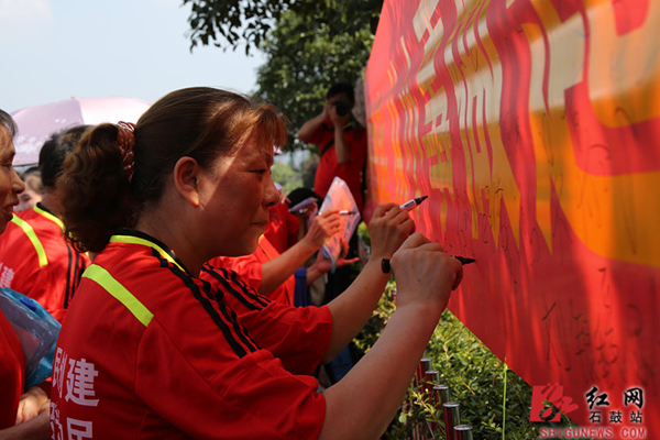红网石鼓站7月14日讯(通讯员 李文恋 刘国华 王朝顺)“我宣誓,从今天开始,我不随地吐痰,不乱倒乱扔垃圾……”7月13日,衡阳市石鼓区150余名市民代表在解放路亲水平台郑重宣誓,承诺践行《市民文明公约》和《石鼓区文明市民“十不”规范》,并在签字布上签名,为“争创文明城,争做石鼓文明人”贡献力量,这是石鼓区人民街道开展“文明之约·你我同行”文明创建活动的一幕。区政协主席王仲晓宣布活动开幕,区委常委、宣传部长周文源致辞。