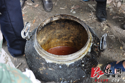执法人员打开油桶,发现初步提炼的潲水油。
