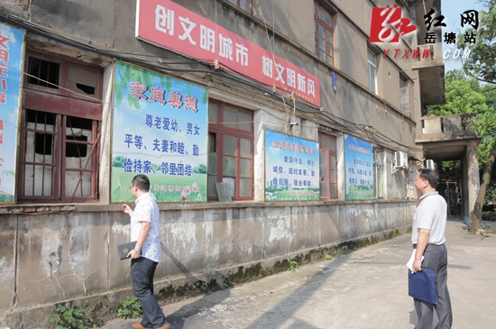 红网岳塘站7月15日讯(分站记者 朱维)7至11月份,湘潭市将迎来为期半个月的第一次“国检”。为督促湘潭市岳塘区辖区范围内各单位、各部门扎实做好实地迎检工作,营造创建全国文明城市浓厚氛围,7月14日,区创建办效能督察组采取随机抽访、实地察看的方式兵分两路对全区13个乡街开展了创建工作现场督查,并对发现的问题,当场提出了整改要求。此次督查主要检查刊播的公益广告制作是否精美、主题是否突出、点位是否实现全覆盖、内容是否全面(涵盖社会主义核心价值观、创建全国文明城市宣传、爱党爱国、中国梦、传统美德、环境保护等内容),并重点检查了街道各小区重要位置、各楼栋的楼梯间入口处和电梯入口处的创建宣传是否到位。