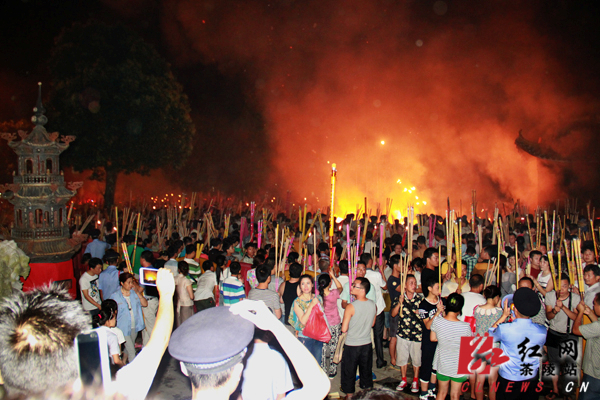 子时一到,万名香客在警察的指引下有序的涌入南岳宫朝拜。