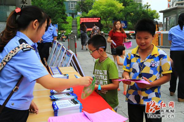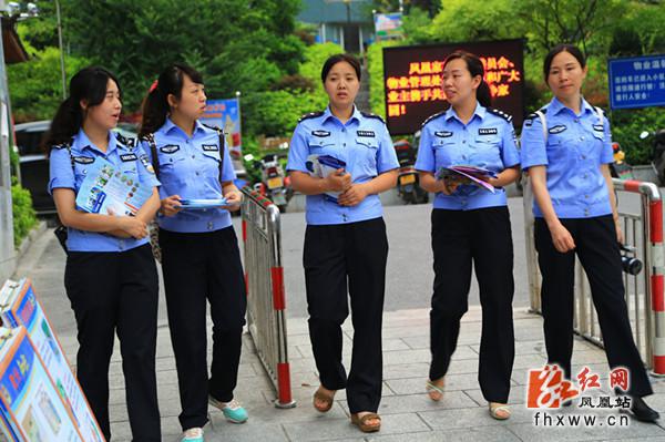 暑期到来,大量学生归家,同时凤凰县进入旅游旺季,流动人口激增,大大增加了影响社会治安的不确定因素。凤凰县公安局立足于该县实际,选取位于古城的城北社区为第一站,展开暑期法制进社区宣传活动,旨在提高社区居民的法制意识,增强居民防骗、防盗、防抢及识毒拒毒能力。7月27日晚6时许,十余名公安民警下班后牺牲休息时间,抓住社区居民下班归家高峰期人流量密集的时机,来到城北佳苑门口摆摊设点,发放法制宣传手册、宣传单,为居民讲解各种诈骗案例,展示仿真毒品模型,并发放了印有禁毒知识的宣传扇,在炎炎夏日为居民带去知识的同时送上了阵阵清凉。到晚8时左右,社区内响起音乐,民警们走上操场与前来跳“广场舞”的社区居民们沟通互动,在欢乐中传播法制知识,受到了居民们的热烈欢迎。