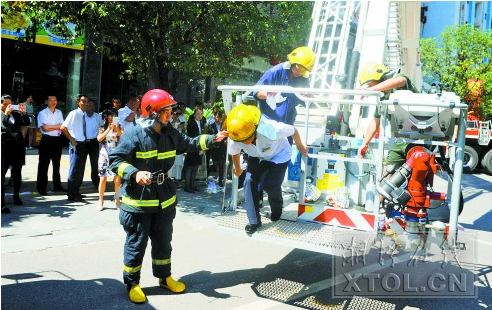 演练现场,酒店工作人员拿着灭火器材扑救,疏散旅客到安全地带。由于火势较猛,两名旅客被困饭店疏散平台,正用白毛巾挥手求救。此时,消防部门出动的消防车辆赶到现场,消防官兵立即展开云梯将被困人员解救出来,受伤人员经现场救治,脱离生命危险,演练取得圆满成功。