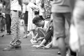 8月5日,樟树坪小学门口站满了家长,一位家长正蹲下整理要提交的资料。 《长株潭报》记者金林摄