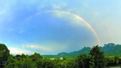 8月5日傍晚7时许,一场阵雨过后,张家界市城区上空出现两道彩虹,上演一幕彩虹与夕阳相互映衬的美景。