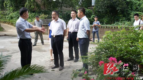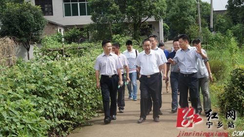 图:湖南省委宣传部副部长、省文明办主任刘进能(图中),长沙市委宣传部副部长、市文明办主任郑力虎(左一),宁乡县委常委、宣传部长王湘云(右一)等调研夏铎铺镇高新社区周家湾组。