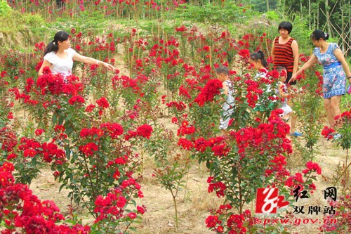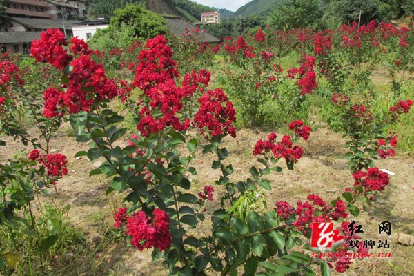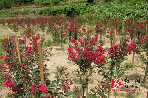 红网双牌站8月14日讯(通讯员 谭润昕)夏末秋初,双牌县五星岭林场,百亩“紫薇”盛开红色花朵,鲜艳似火,美不胜收,不少游客和摄影爱好者前来赏花合影留念。这是双牌县五星岭林场双牌县林牧生态科技开发有限公司首次引进的“红火箭”、“红火球”、“红叶”紫薇。该公司今年共引进5000余株,分别种植在该公司牛栏坪和朝阳两个基地上。这些紫薇树姿优美,树干光滑洁净,花色艳丽,有大红、猩红、玫瑰红、粉红等颜色,紫薇树姿优美,开花时正当夏秋少花季节,花期长,由6月可开至9月,故有“百日红”之称,真是“浪漫十旬花最久、引人入胜醉初秋”。