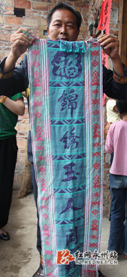(两边的字符为现代瑶家织锦上出现的“瑶族文字”。李光平/摄)