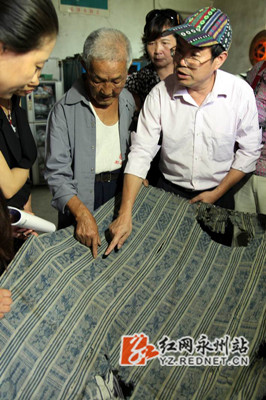(2012年7月,奉兴朝老人(前右二)与语言专家在指认“八宝被”上的“瑶族文字”。李光平/摄)
