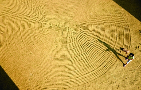 8月22日,双峰县井字镇石奇村,村民在晾晒稻谷。今年,该县推广“超级杂交中稻+再生稻”项目,采用测土配方施肥、水稻病虫害专业化防治等技术,据县农业局和统计局抽样测产,今年的中稻平均亩产预计可达605.9公斤。李建新 摄