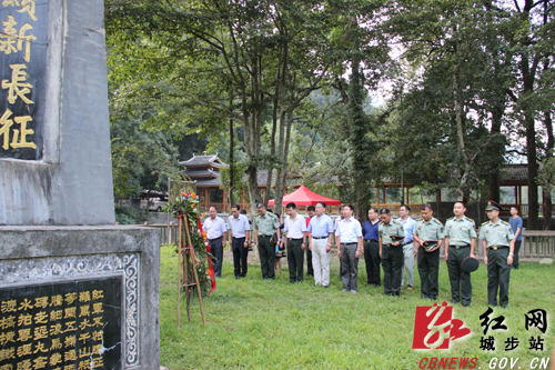 广州军区副司令员邢书成(左五)一行瞻仰长坪村红军纪念碑