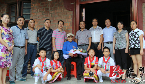 图为慰问组与朱正成老人合影。肖丁勤摄
