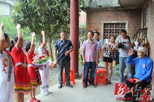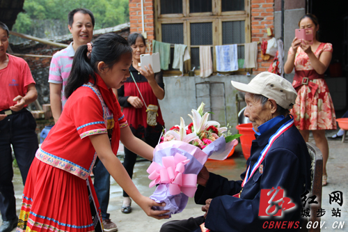 家住儒林镇中心社区的朱正成老人今年已94岁高龄,除听力有些失聪外,精神状况看起来还不错。县红旗小学四名少先队员向老人献花,老人坐在椅子上回敬军礼。朱正成老人1921年3月出生, 1938年志愿入伍,跟随中国远征军参加过滇西大反攻战役。老人说,当年城步共有300多名热血青年自愿入伍参战,保家卫国,抗击日寇。战争的销烟早已散去,老人至今对1944年9月远征军滇西大反攻的关键一战“松山战役”仍记忆犹新。慰问组嘱咐其家属一定要照顾好老人的身体,让老父亲安享幸福晚年。