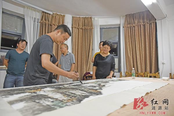 画家创作的作品把湄江的神韵表现得淋漓尽致,涟源市委书记谢学龙(右一)在旁驻足欣赏