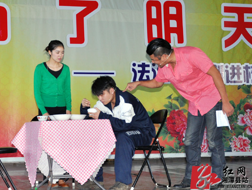 红网湘潭县站9月17日讯(分站记者 龙蓉)在网吧中玩游戏玩得天翻地覆、因学习与父母吵得不可开交、受“江湖朋友”鼓惑而误入歧途……9月15日,这些生活中常见的一幕幕被搬上县职业技术学校大礼堂的舞台,以法治小品剧的形式演绎出来,让在场的1000余名师生深受启发。当天,湘潭县青少年法治宣传教育周活动在该校正式启动。启动仪式后,省话剧院的演员们还进行“为了明天”法治小品剧巡演。此次法治小品剧表演由省委法治办、省司法厅联合湖南省话剧院精心编排,全部以典型案例为题材,包括《绿色网吧》、《家》、《拒绝摇头》等小品剧。演员表演生动形象,语言幽默风趣,情节跌宕起伏,贴近实际,十分具有教育意义,获得台下师生一阵阵掌声。“在这些节目中,我们都可以找到自己生活中的一些影子,可以给我们起到警示作用。”351班的胡碟说,她感觉自己和《家》中的“文俊”十分相像,父母感情不和,缺乏家庭的温暖,但小品中“文俊”的悲惨结局让她明确必须更加努力学习,不能自暴自弃,不然将葬送自己的前途。