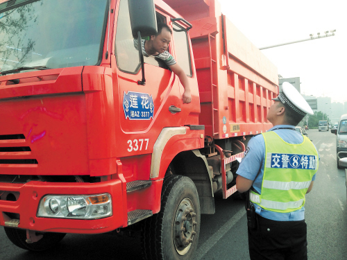 长沙公安交警特勤大队近期持续在长沙主城区开展了针对渣土车的专项检查,重点加强主城区内工程运输车辆、危爆物品运输车辆的严查。目前,已拘留无证驾驶者4人,暂扣涉牌涉证渣土车156辆,满分扣证72起,查处闯红灯、闯禁区等236起。图为民警正在查处一辆违法渣土车。