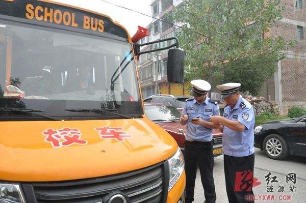 (公安交警在检查校车驾驶员的驾驶证、驾驶资质及校车车辆的行驶证。)