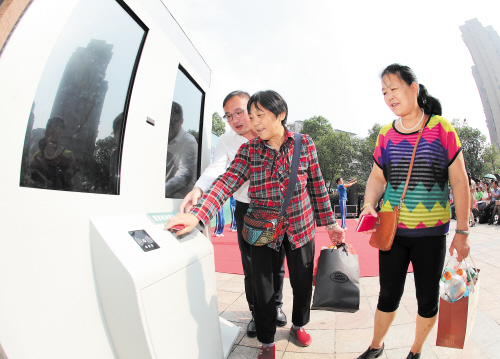 刷卡领取二维码,再将垃圾分类投箱,昨日亮相东宜社区的智能垃圾桶,吸引居民纷纷来当环保达人。 长沙晚报记者 陈飞 摄