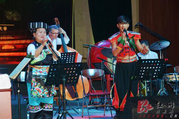 红网吉首站9月23日讯(分站记者 张魏 实习生 牟晓梅 陈芳玲)当湘西苗鼓遇上法国长笛,咚咚喹融入爵士乐,会奏出怎样的乐章?9月22日晚,“天籁在人间”吉首大学专场音乐会精彩上演。来自法国卢瓦尔河谷中央大区的音乐家与湘西土家族、苗族歌手共同演绎了一场浪漫法国与原生态湘西的绝妙“交响”。音乐会上,美妙的音符次第涌来,既有结合了苗歌元素的爵士乐,也有吸收了土家族元素创作而成的流行音乐,更有法国传统音乐与山歌的合奏、合唱……开场曲目《相遇苗族》,融合了法国音乐家的钢琴、长笛、风笛等和苗族音乐人的苗鼓、芦笙、吹木叶,流动如水的法国浪漫旋律与粗狂豪放的湘西音乐穿越国界、独树一帜。宛如天籁的乐声萦绕着整个音乐大厅,现场观众无不沉醉其中、凝神聆听。