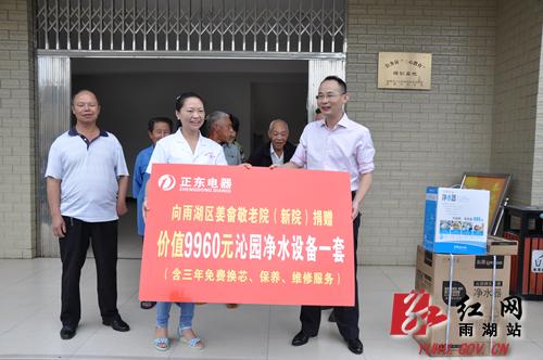 红网雨湖站9月24日讯(分站记者 谢岳峰)9月22日下午,湘潭市人大代表、湖南省正东电器有限公司董事长谢少良一行在雨湖区人大常委会副主任潘惠玲以及区民政局相关负责人的陪同下,将4套总价值为3.6万余元的直饮水设备先后送到了姜畲镇、先锋乡、长城乡敬老院以及城正街街道三义井社区老年人活动中心。“饮水卫生很重要,安装净水设备就是为了让老人们喝水更健康。”谢少良表示,此次除了捐赠直饮水设备外,正东电器团队还将对这些设备实行三年的免费换芯、保养、维修等服务。当天,在长城乡敬老院内,谢少良一行还看望了抗战老兵李桂伏,为他送去了慰问金。今年102岁高龄的李桂伏曾是抗战前线的一名司号长,说起话来口齿清晰,中气十足,对那段当兵的岁月,他依然记忆犹新。