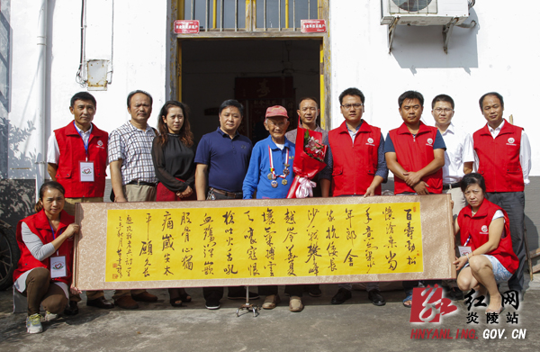红网炎陵站9月24日讯(分站记者 彭新平 通讯员 周新文)9月23日,在中秋、国庆两节来临之际,县政协副主席黄建林在鹿原镇镇政府负责人陈一龙、罗玉英的陪同下,来到该镇洣西村抗战老兵谭祖成的家里进行了走访慰问。黄建林用自己独特的构思,挥毫泼墨,精心创作了诗词《题抗战老兵》的书法作品专程敬赠老兵谭组成,以独特的方式为炎陵藉抗战老兵送去祝福以及节日的慰问。