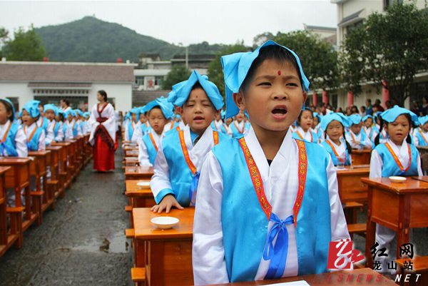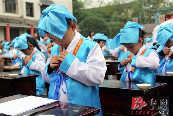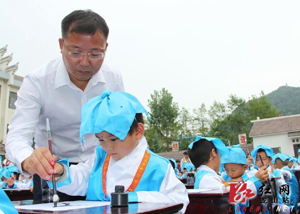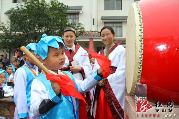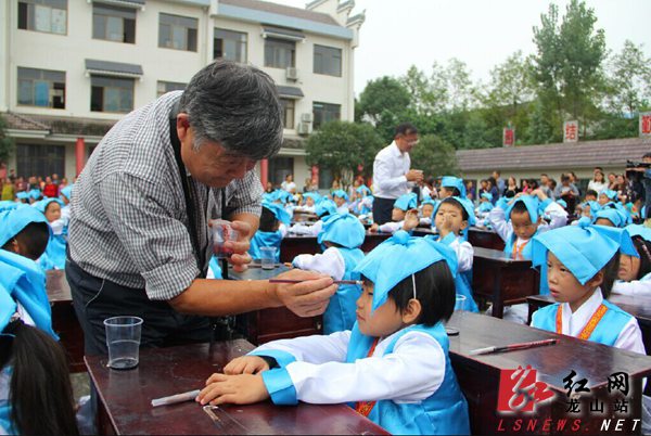 红网龙山站9月29日讯(通讯员 彭杰 戴礼生)9月28日,在孔子诞辰2566年之际,有“中国历史文化名镇”“秦简故乡”之称的湖南省龙山县里耶镇里耶小学518名一年级新生举办了“破蒙启智”开笔礼仪式。