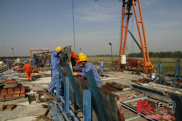 红网君山站10月8日讯(分站记者 周旭 王吉平)10月4日,在临岳高速公路洞庭湖大桥建设施工现场,沿线最高的210米大型桥墩梁已于下午5点正式落架到位,这是君山区国庆期间倾力服务重点工程建设抢抓工期的又一重要成果。君山区现有杭瑞高速公路,蒙华铁路2条交通大动脉正在紧张施工,具体分为临岳高速、荆岳铁路、公路大桥与铁路大桥四大工程。两路两桥的建设是推动君山经济社会加快发展的新机遇,是打造君山生态明珠、造福君山人民的重要推动力量。国庆期间天气晴好,是洞庭湖(铁路、公路)大桥施工的最佳时期,为抢抓时间和进度,君山区在建的国家重点工程项目两路两桥的施工人员全部坚守在施工一线,趁着国庆晴好天气抢抓进度。在负责临岳高速洞庭湖大桥建设的大岳高速14标现场,许多工人正在紧张的进行装模、搭架,做到大桥在一个又一个的桥墩中间联接延伸,晚上就抢抓晴好天气进行卸模,以备第二天又进行装模。来自四川的杨正新正在紧张有序地进行装模,他一边拧着镙丝一边介绍:“公司对我们非常重视,国庆期间不但有加班工资,还每天加餐,并安装了多部电话让我们在空闲时间家里联系沟通,人性化的服务,让我们深受感动。”