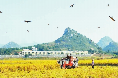 时刻新闻 —分享— 10月8日,嘉禾县广发镇圳头村,村民在收割晚稻。今年,该县加大国家粮食补贴政策宣传,并组织农技人员跟踪指导,激发了农民种粮积极性。目前,10.6万亩晚稻陆续进入收割期。黄春涛 摄 来源:湖南日报 编辑:王娉娉