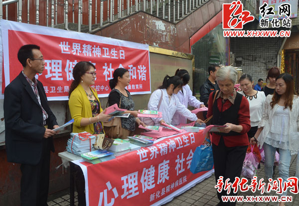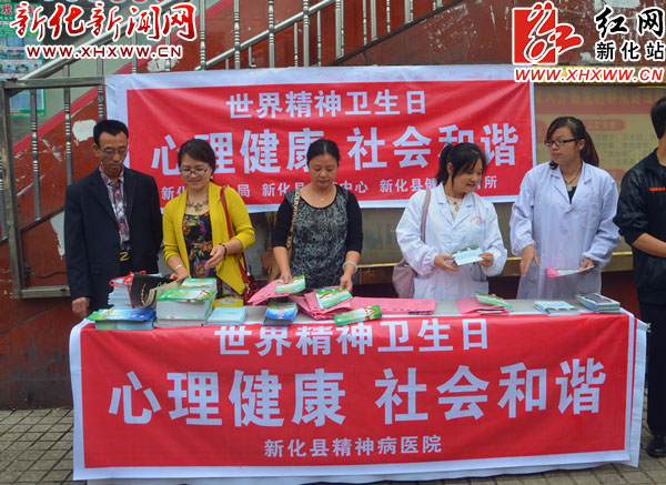 红网新化站10月11日讯(分站记者 王彬 通讯员 谢菲)10月10日是世界精神卫生日,今年的主题是“心理健康,社会和谐”。当天,新化县卫生局、县疾控中心、县精神病院联合在街头摆点,开展关爱心理健康宣传活动。