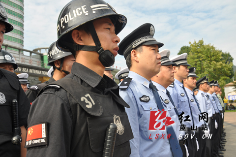 红网蓝山站10月13日讯(分站记者 李宗凯 通讯员 蒋敏)为深入贯彻落实全省公安机关电视电话会议精神,维护全县良好社会治安、推动全县经济社会发展、确保人民安居乐业。10月13日上午,蓝山县社会治安严打整治“亮剑”专项行动誓师大会在县三蓝广场举行。永州市公安局党委委员、副局长秦建彪,蓝山县委常委、政法委书记黄小兵,县人大常委会副主任郭晓武,县政府副县长提名候选人、县公安局长候选人李月红,县政协副主席盘运贵,县人民法院院长柏国平,县人民检察院检察长吕新陵等领导出席大会。来自县公安、交警、武警、消防、森林等各警种单位代表,县直相关单位负责人及各乡镇场办事处分管政法综治负责人等近300余人参加。大会由县公安局政委秦学君主持。
