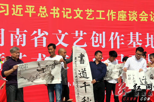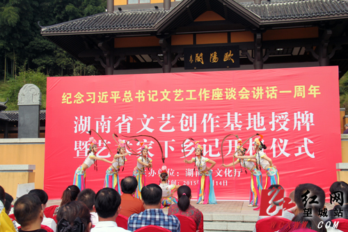 红网望城站10月15日讯(分站记者 刘赛)10月14日,湖南省首批文艺创作基地授牌仪式暨艺术家下乡记开拍活动在望城区书堂山欧阳询文化园举行。为深入贯彻习近平总书记文艺座谈会的讲话精神,繁荣湖南省文艺创作事业,丰富人民群众精神文化生活,建立湖南省“深入生活、扎根人民”主题活动长效机制,省文化厅在全省选取了32个单位为湖南首批文艺创作基地。同时,为结合“深入生活、扎根人民”主题活动,省文化厅与湖南卫视将共同策划拍摄“艺术家下乡记”专题纪录片,通过电视专题片录制湖南省艺术家深入基层、深入生活的真实写照。