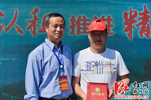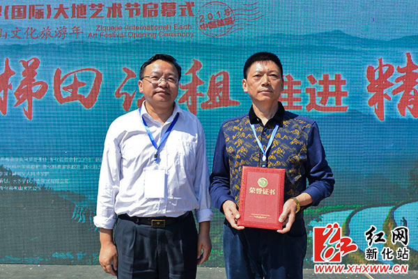 (新化县委副书记、县长邓光吕为梯田认租者颁发了“紫鹊界荣誉村民证书”。)