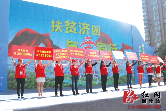 康月林致辞中指出,近年来,醴陵市扶贫工作在市委、政府的坚强领导下,经过全市人民的不懈努力,取得了较好的成效。但由于受自然条件和经济基础等多方面因素制约,贫困地区基础设施落后、公共服务不足等问题依然存在。全市仍有20个贫困村,36758名贫困人口。市委、政府高度重视扶贫开发工作,召开了扶贫攻坚专题大会,出台了工作实施方案;同时,由全体市级领导牵头,按照网格管理责任划分,将每一个贫困户扶贫任务落实到了相关网格责任人,向20个贫困村派驻了驻村帮扶工作队。康月林强调,扶贫帮困是中华民族的传统美德,扶贫济困,需要全社会共同参与;回报社会,是全体市民义不容辞的责任。他号召全市各级各类机关单位、广大党员干部和各行各业的仁人志士都行动起来,真心诚意播撒一份爱心,自觉自愿捐出一份善款,让扶贫济困、助人为乐成为一种社会风尚;让乐善好施、关爱他人成为一种自觉习惯,用爱心凝聚人心,用关怀温暖社会;全市上下同心同德汇聚正能量,群策群力共筑中国梦,为全面建成小康社会作出应有的贡献。